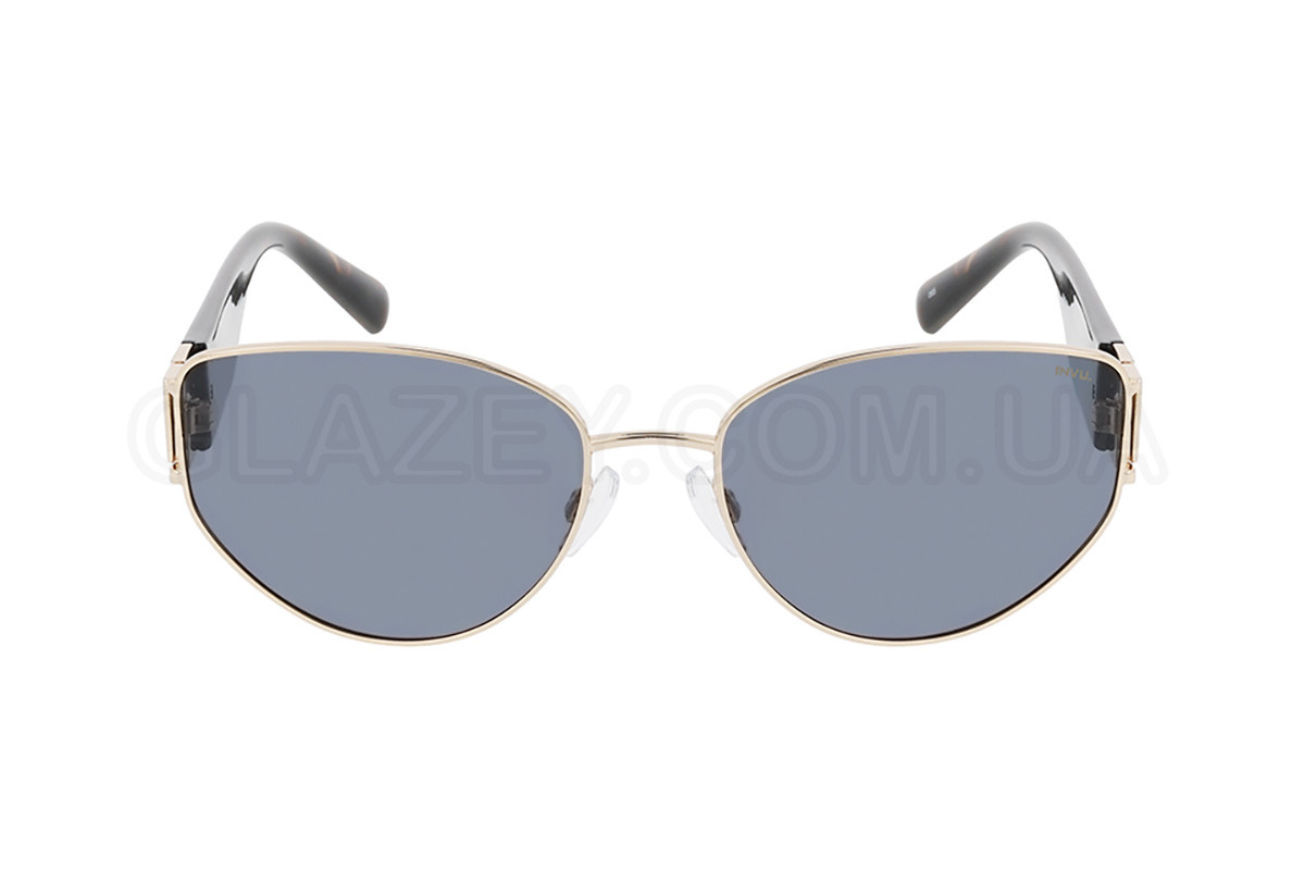 - Особенности оправы: Коллекция Core / Чёрный эмалевый логотип INVU на золотистой основе широких заушников / Комфортные силиконовые носовые упоры с возможностью регулировки для идеальной посадки / Возможность вставки линз по рецепту офтальмолога